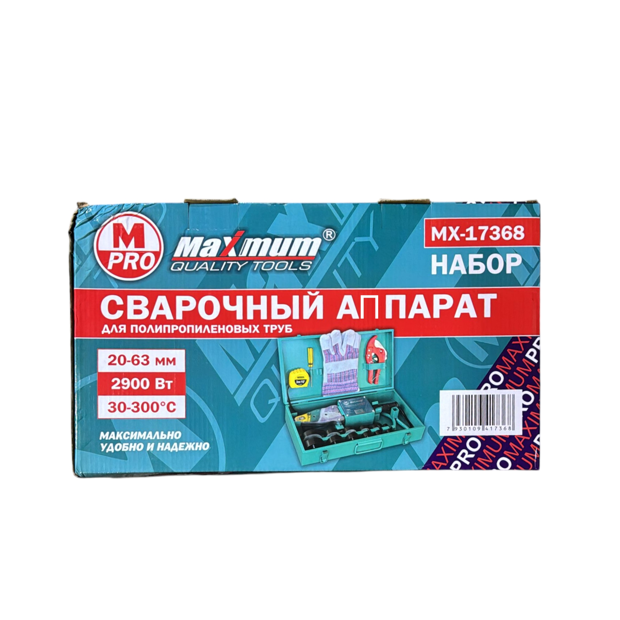 Набор для пайки полипропиленовых труб содержит сварочный аппарат от "Maximum" - модель с мощным нагревателем (2900 Вт) и широким диапазоном плашек.