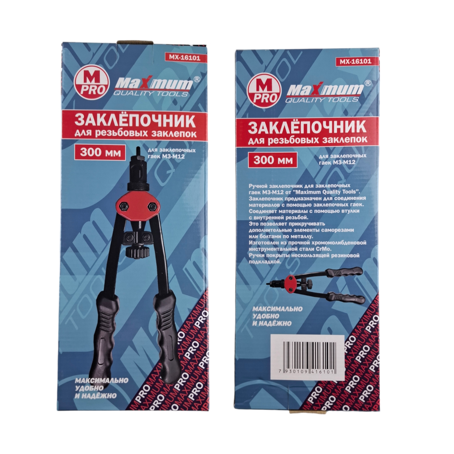Повышенная прочность инструмента достигается благодаря тому, что рабочие губки изготовлены из стали и закалены. Специальный механизм - двуручный, позволяет снизить усилие, необходимое для установки заклёпки. После установки заклёпки винт легко выкрутить благодаря специальному ролику.